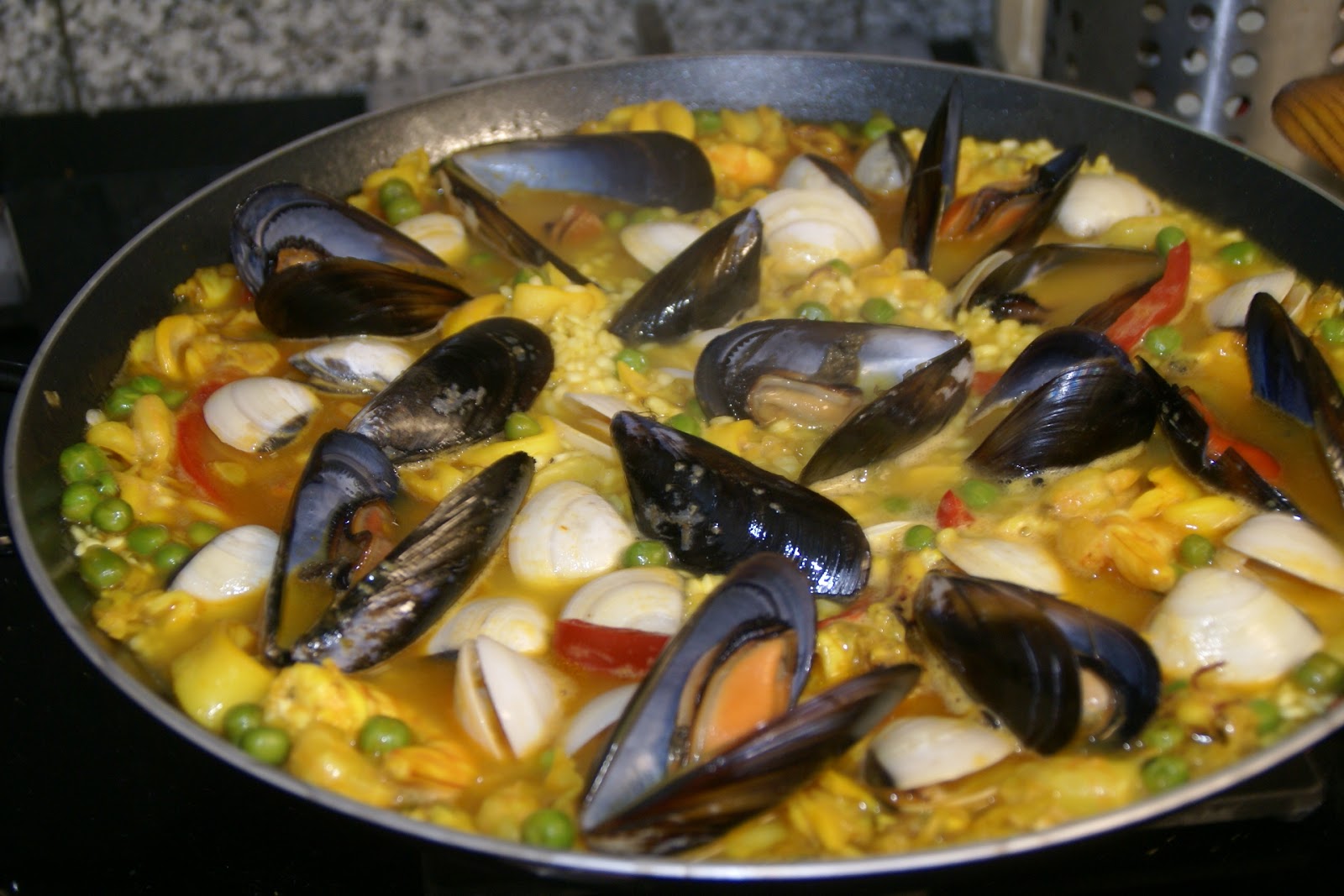 Numa paelheira (frigideira da Paella)coloque a cebola picada finamente. Deixe refogar. De seguida, junte o pimento e as lulas, previamente, escaldadas; junte as ervilhas. Refogue e junte o açafrão e a polpa de tomate. Deixe apurar durante alguns minutos. Adicione os mariscos e deixe ferver. De seguida junte o arroz e mexa bem.
