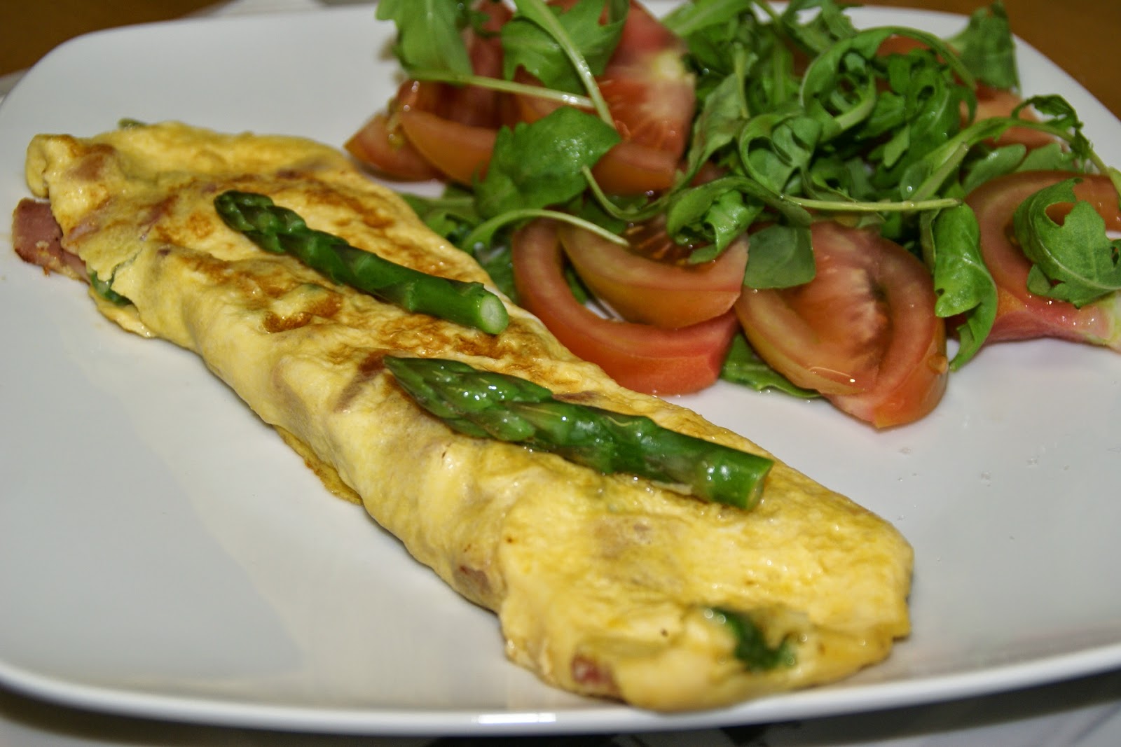 Leve uma frigideira ao lume com manteiga; deixe aquecer bem. Verta na frigideira os ovos batidos; deixe coagular um pouco e adicione o presunto e os espargos (reserve 2 pontas para decorar). Enrole a omelete com cuidado. Vire-a para que fique dourada de ambos os lados.