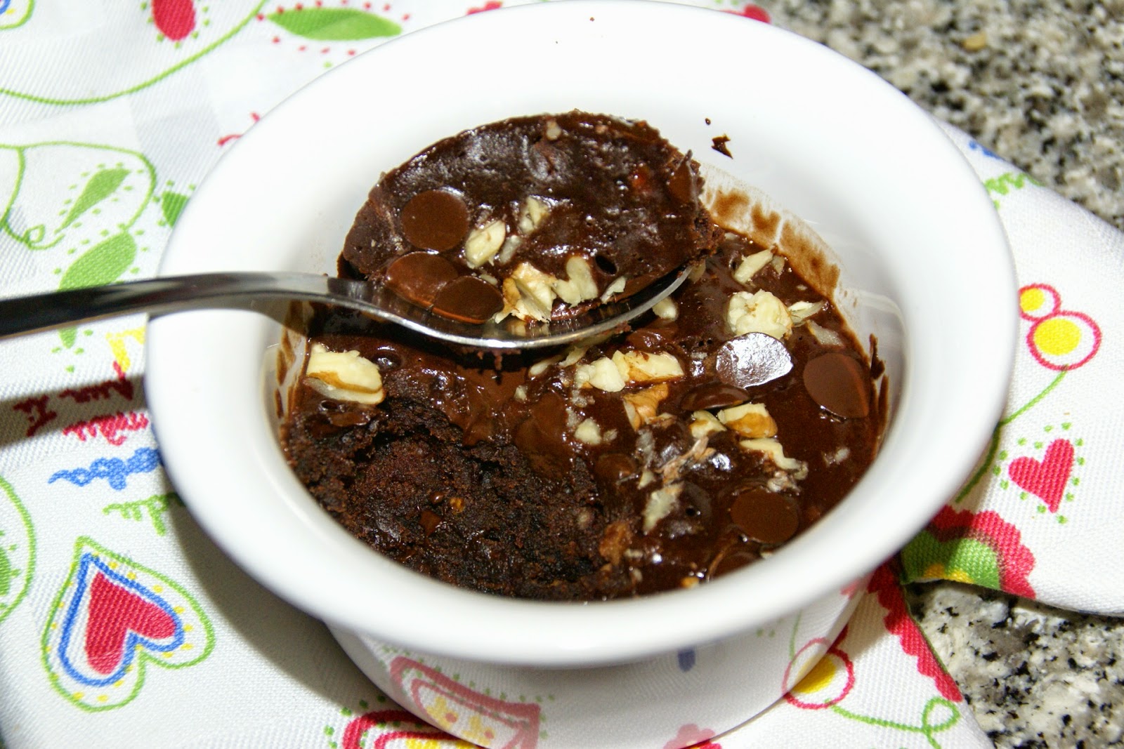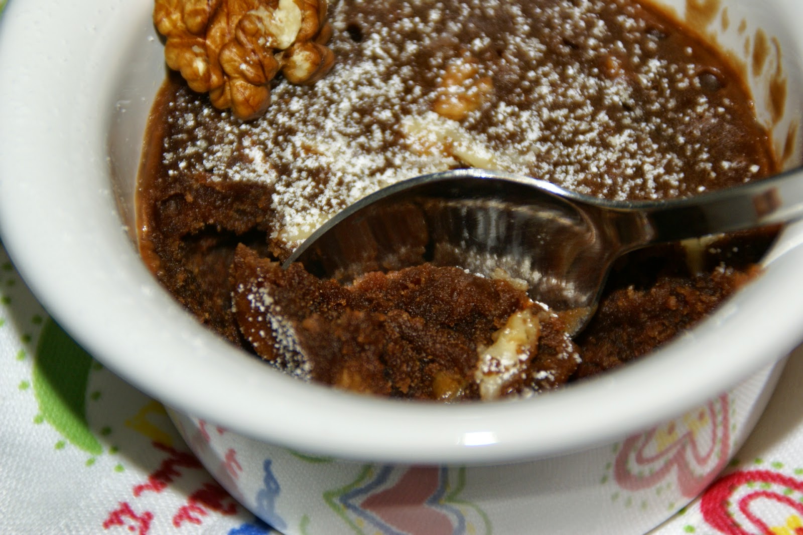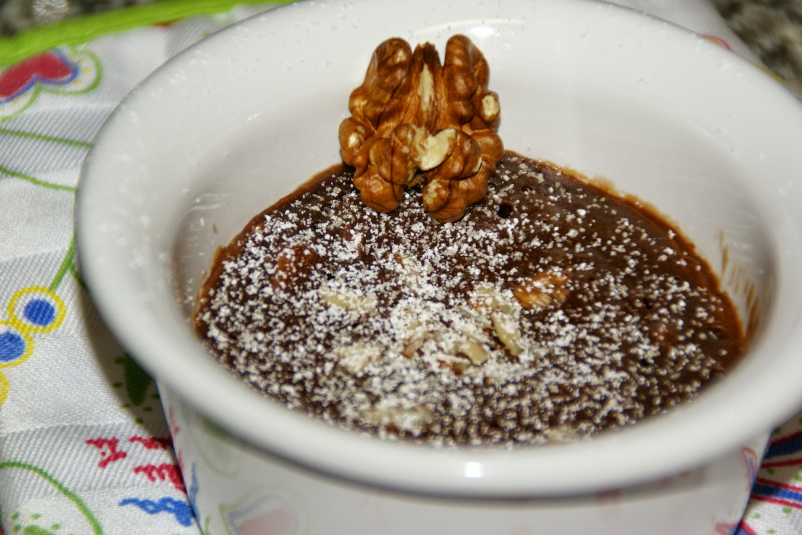 Nota: se gostar pode adicionar 1 colher (chá) de gotas de chocolate à massa e mexer bem. Depois polvilhar com algumas antes de ir ao microondas. Fica um Brownie mais húmido.