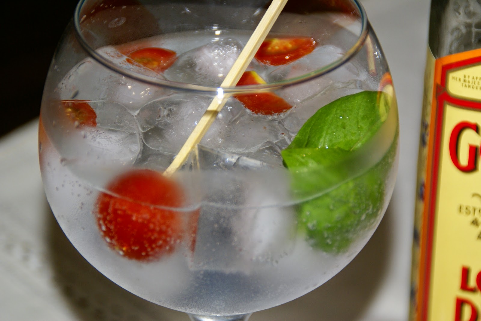 Coloque gelo num copo de pé alto. Deixe esfriar o copo e rejeite a água sobrante. Verta o gin Gordon's. Corte 1 tomate cereja em quatro e junte ao gin. De seguida, acrescente a água tónica com a ajuda de uma colher de cabo em espiral. Para finalizar acrescente o manjericão. Mexa cuidadosamente.