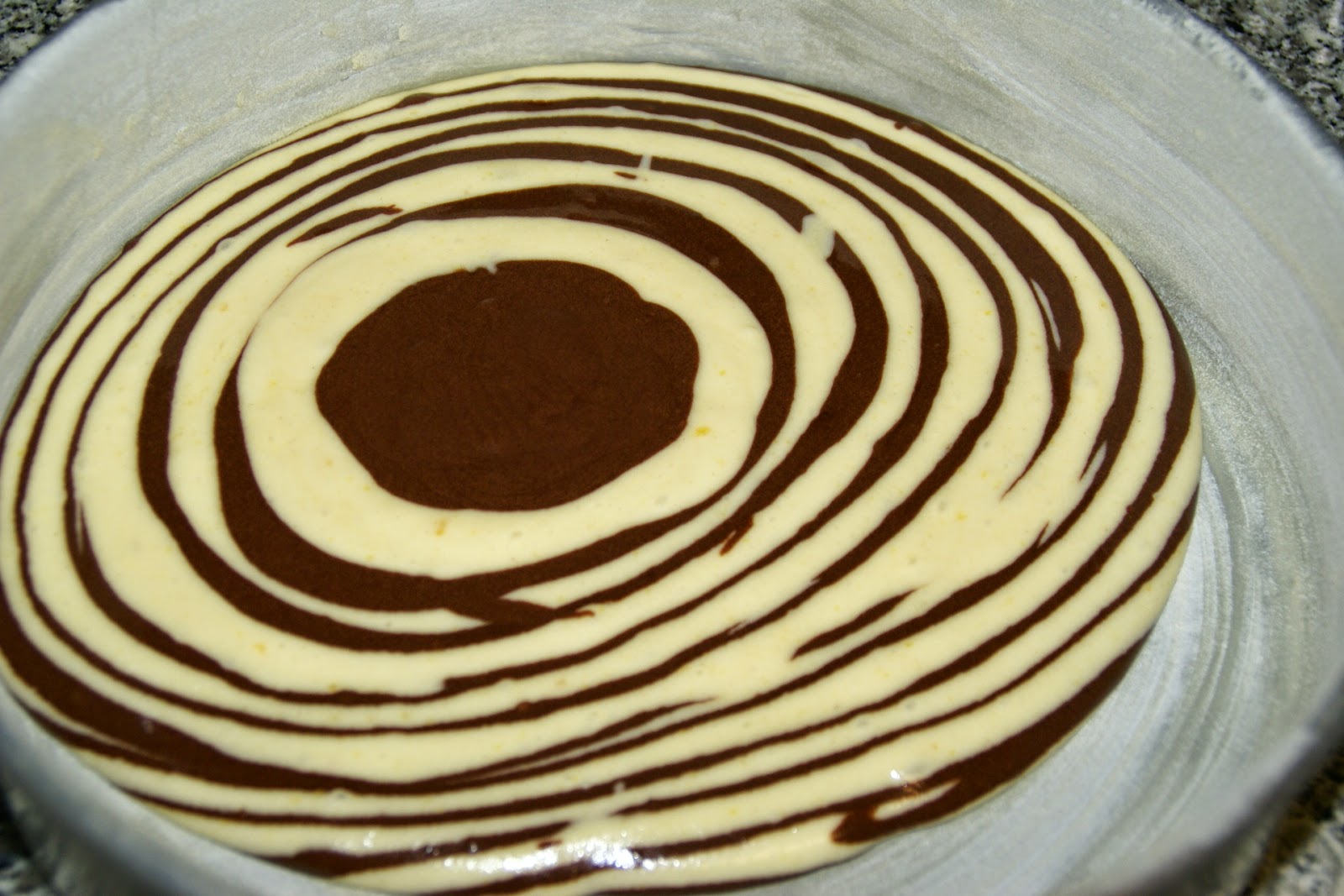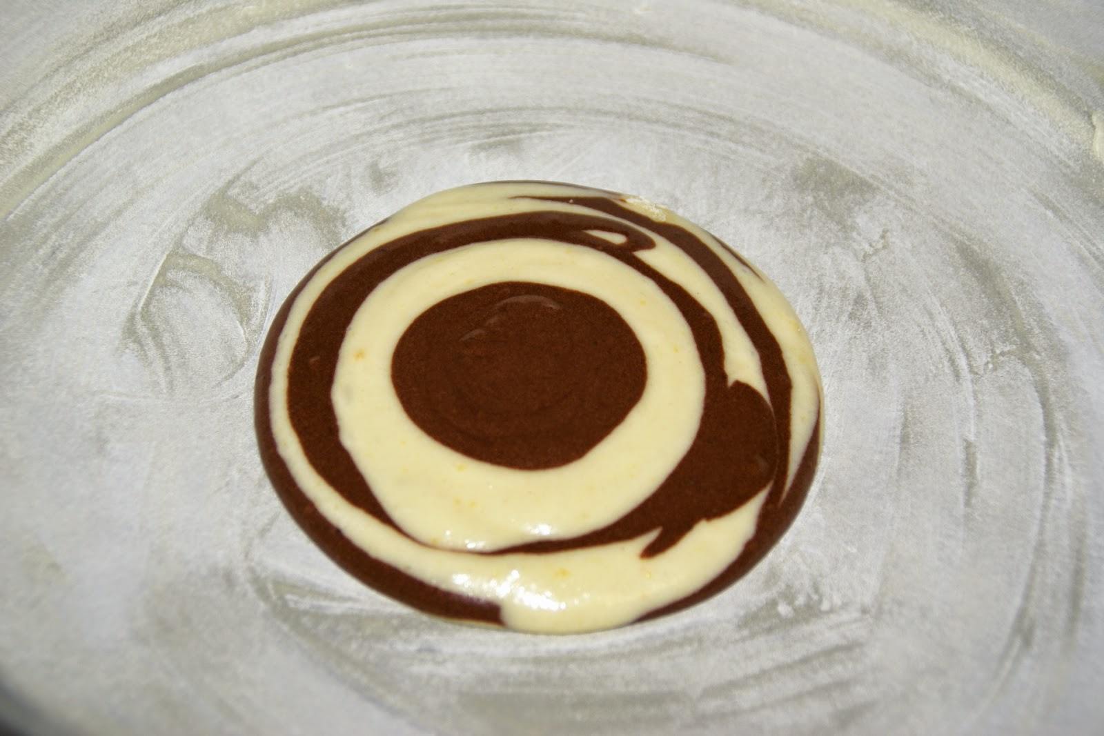 No centro coloque uma colher de massa clara e, de seguida, ao centro coloque uma colher de massa escura. E assim sucessivamente, de forma a obter círculos.