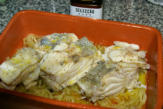 Num tabuleiro que possa ir ao forno, disponha todo o preparado de cebola. Por cima coloque as postas de bacalhau.
