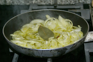 Descasque as cebolas e corte-as em meias-luas finas. Coloque azeite suficiente para cobrir o fundo de uma frigideira e deite a cebola cortada (se gostar pode adicionar o alho picado); junte o piri-piri, o louro e uma pitada de pimenta caiena. Deixe cozer sem ganhar cor.