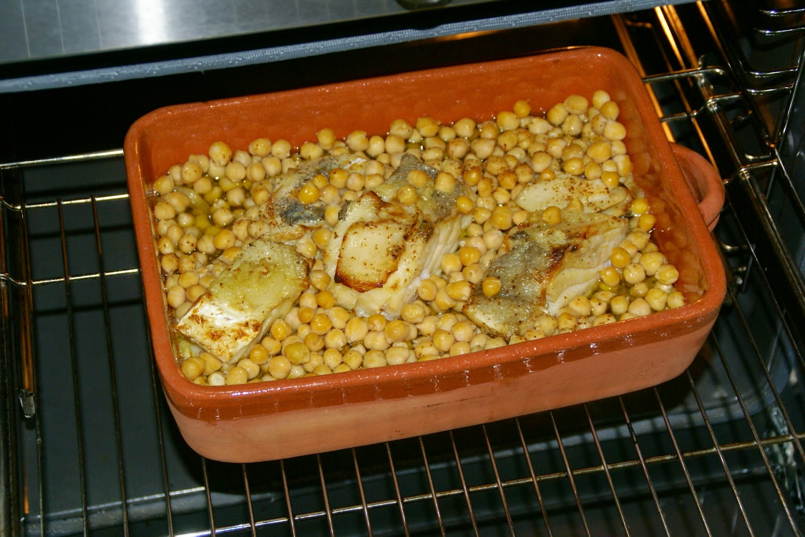 Quando começar a alourar. Abra o forno e adicione o grão de bico, previamente lavado e escorrido. Retifique de pimenta se achar necessário. Deixe acabar de assar até obter um lindo tom dourado.
