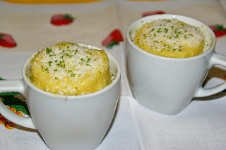 Bata todos os ingredientes até obter uma massa homogénea. Divida a massa por duas chávenas de chá ou uma chávena almoçadeira com capacidade de 250 ml. Pode untar as chávenas com margarina se desejar. Eu não untei.