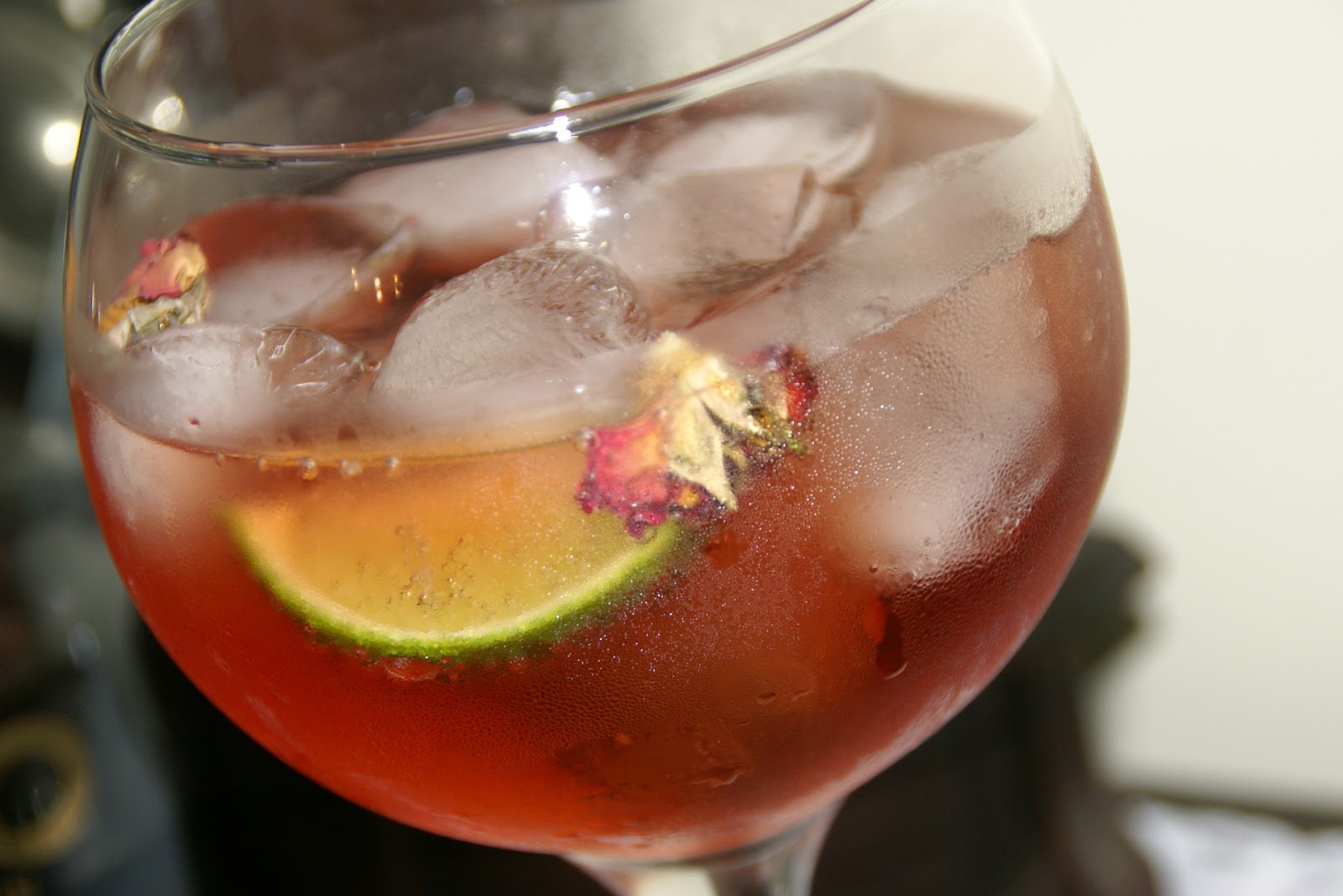 Coloque gelo num copo de pé alto para arrefecer. Retire o excesso de água. Aromatize os bordos do copo com o gomo de lima e dicione as pétalas de rosa. De seguida, verta o gin, e mexa cuidadosamente. Com o auxílio de uma colher em espiral verta a água tónica.