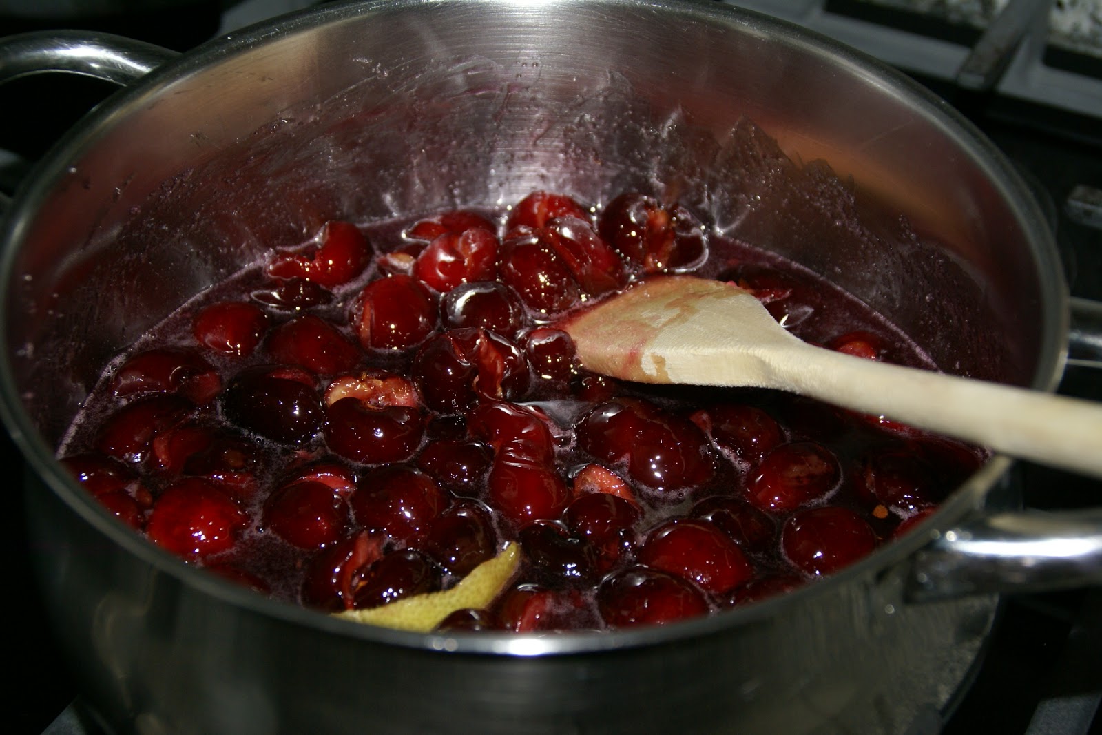 Num tacho coloque as cerejas, a água, o sumo de limão, o açúcar e a casca de limão.