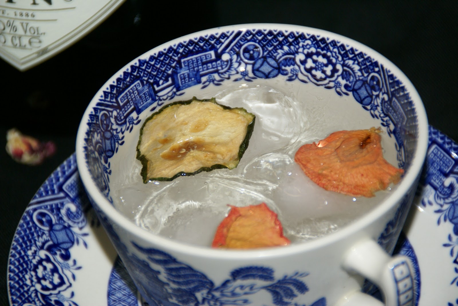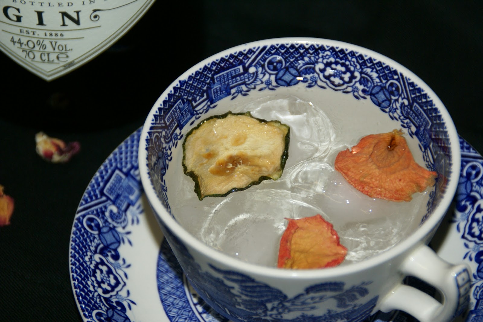 Coloque o gelo na chávena; de seguida, adicione o pepino e as pétalas de rosa. Verta o gin e sirva.