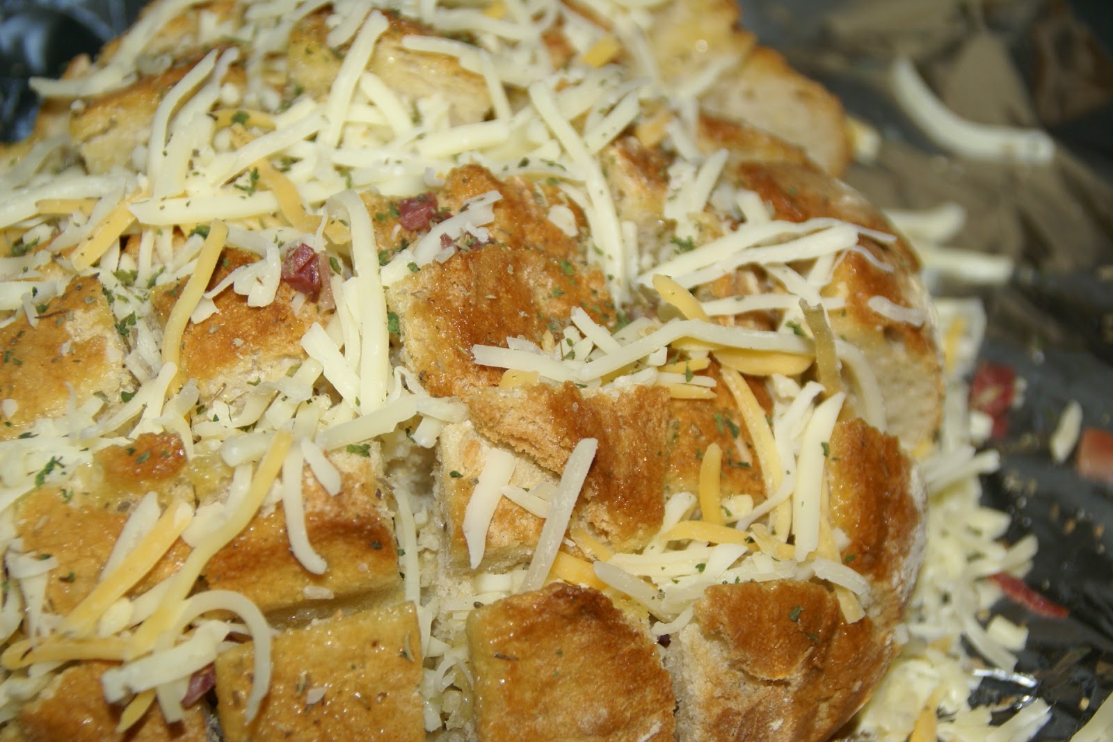 De seguida, e com cuidado, polvilhe com a mistura de queijos ralados. Tenha em atenção, que o queijo deve ser inserido nos cortes efetuados no pão. Polvilhe com mais um pouco de ervas aromáticas.