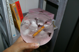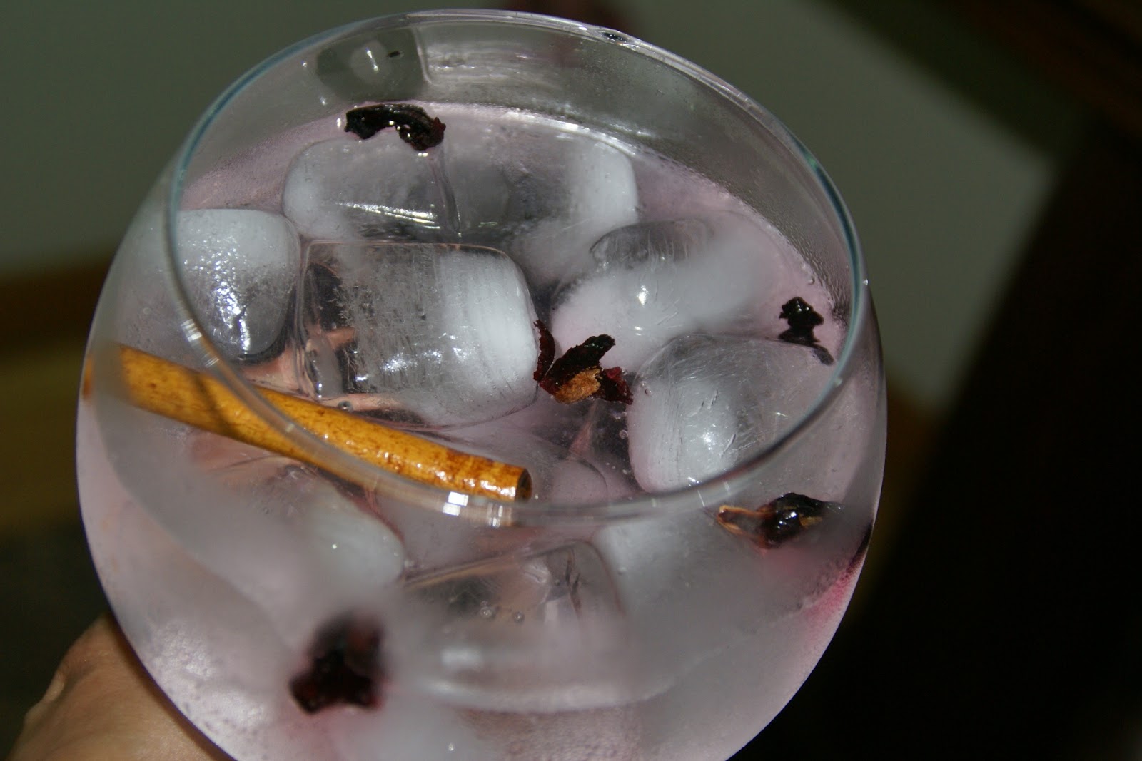 Adicione a canela e as flores de hibisco. Derrame, por cima, o gin; mexa com cuidado.