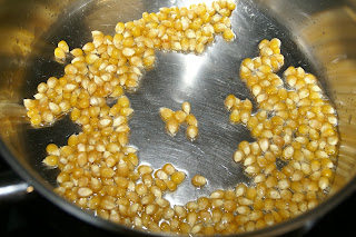 O que vamos precisar para as fazer é o milho para pipoca, que é um milho que estoura quando é aquecido. Parece uma arraial dentro da panela...