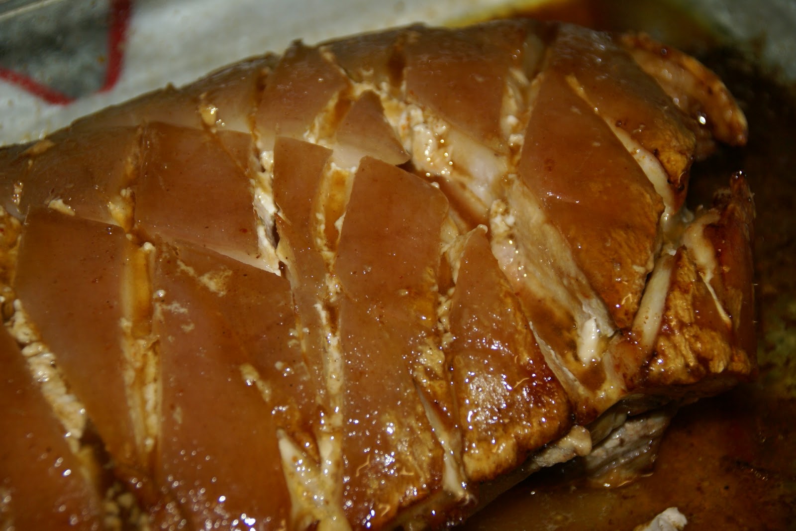 Entretanto a carne vai ganhando cor. Retire novamente a carne e barre com metade do molho que preparou. Vire a carne deixando o couro para cima e barre com o restante molho. Leve novamente ao forno para terminar de assar.