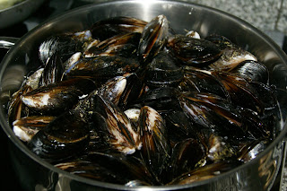 Leve ao lume até começarem a abrir. Escorra a água e reserve os mexilhões.