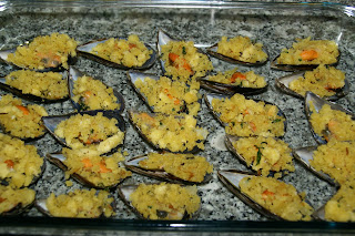 Remova metade da casca dos mexilhões e coloque uma colher (sobremesa) de recheio em cada metade que contém o mexilhão.