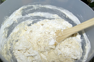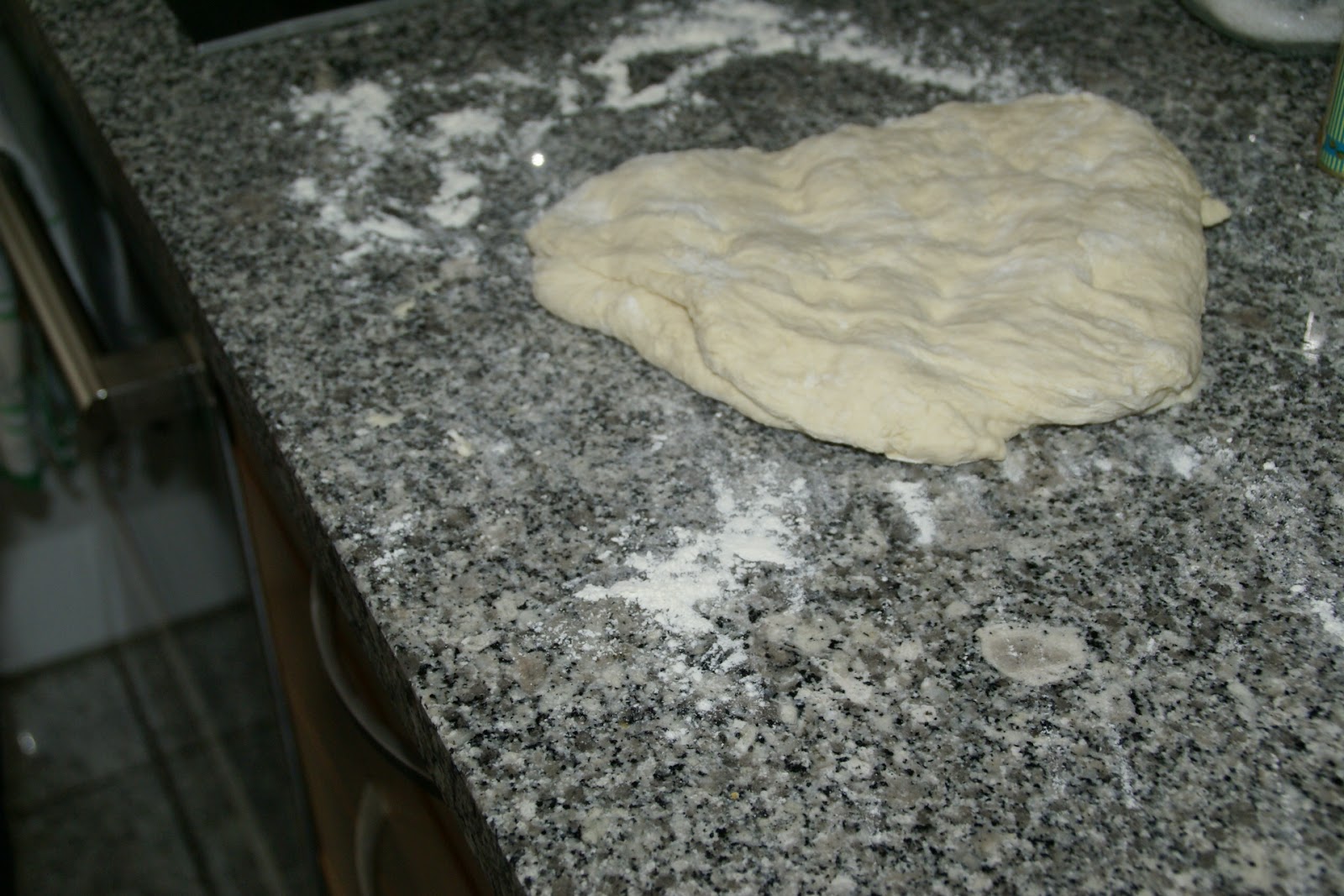 De seguida, polvilhe uma superfície com farinha e trabalhe a massa com as mãos. Tem de trabalhar bem a massa: esticando-a e dobrando-a, várias vezes em sentido contrário.