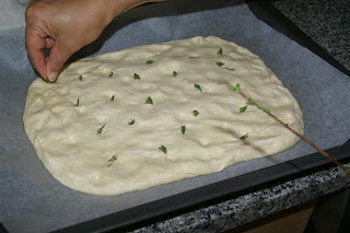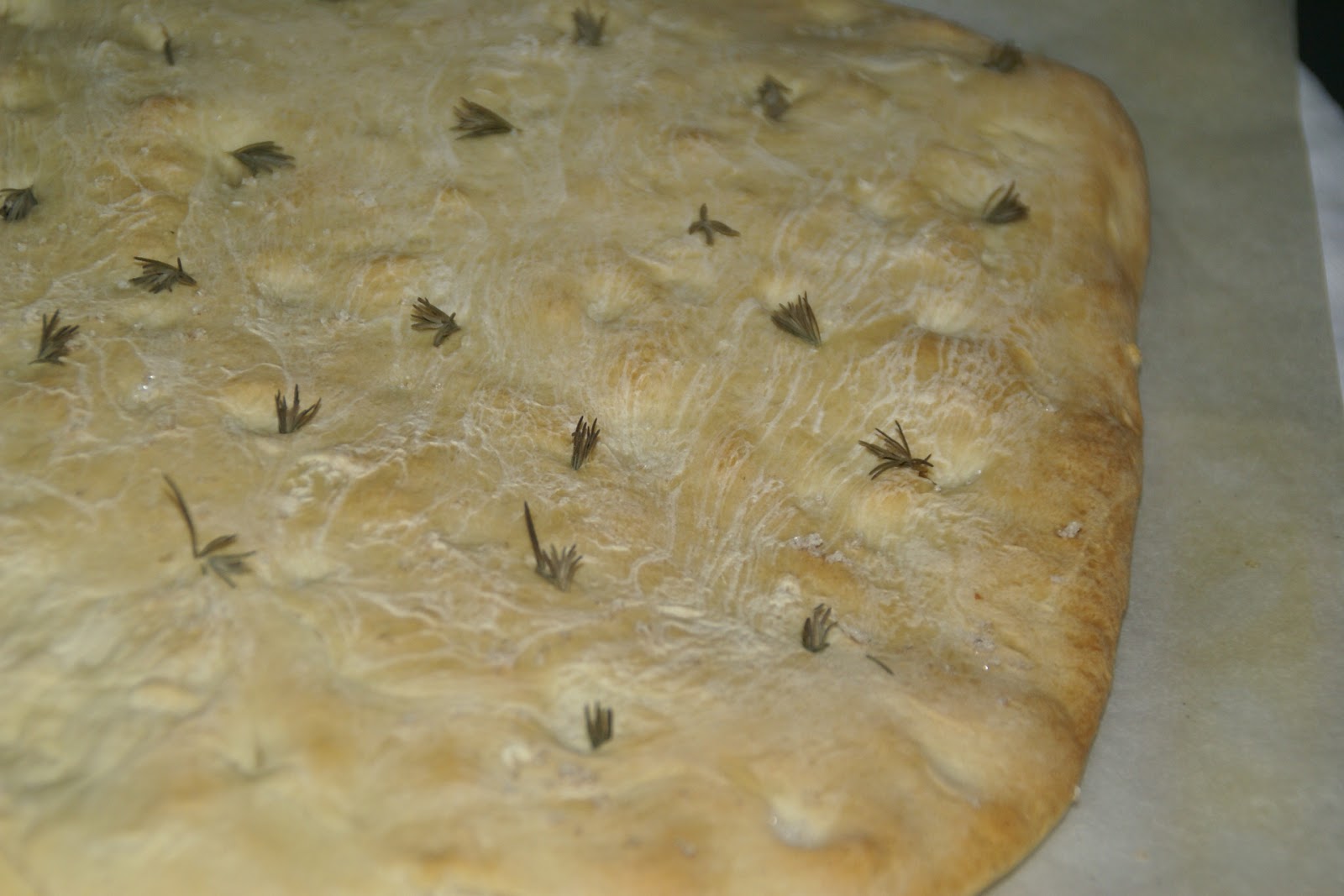 Retire a massa para um tabuleiro (eu forrei com papel vegetal); e, estique-a com a ponta dos dedos. Faça pequenas cavidades onde irá colocar o alecrim. Pincele com azeite toda a superfície.