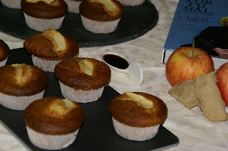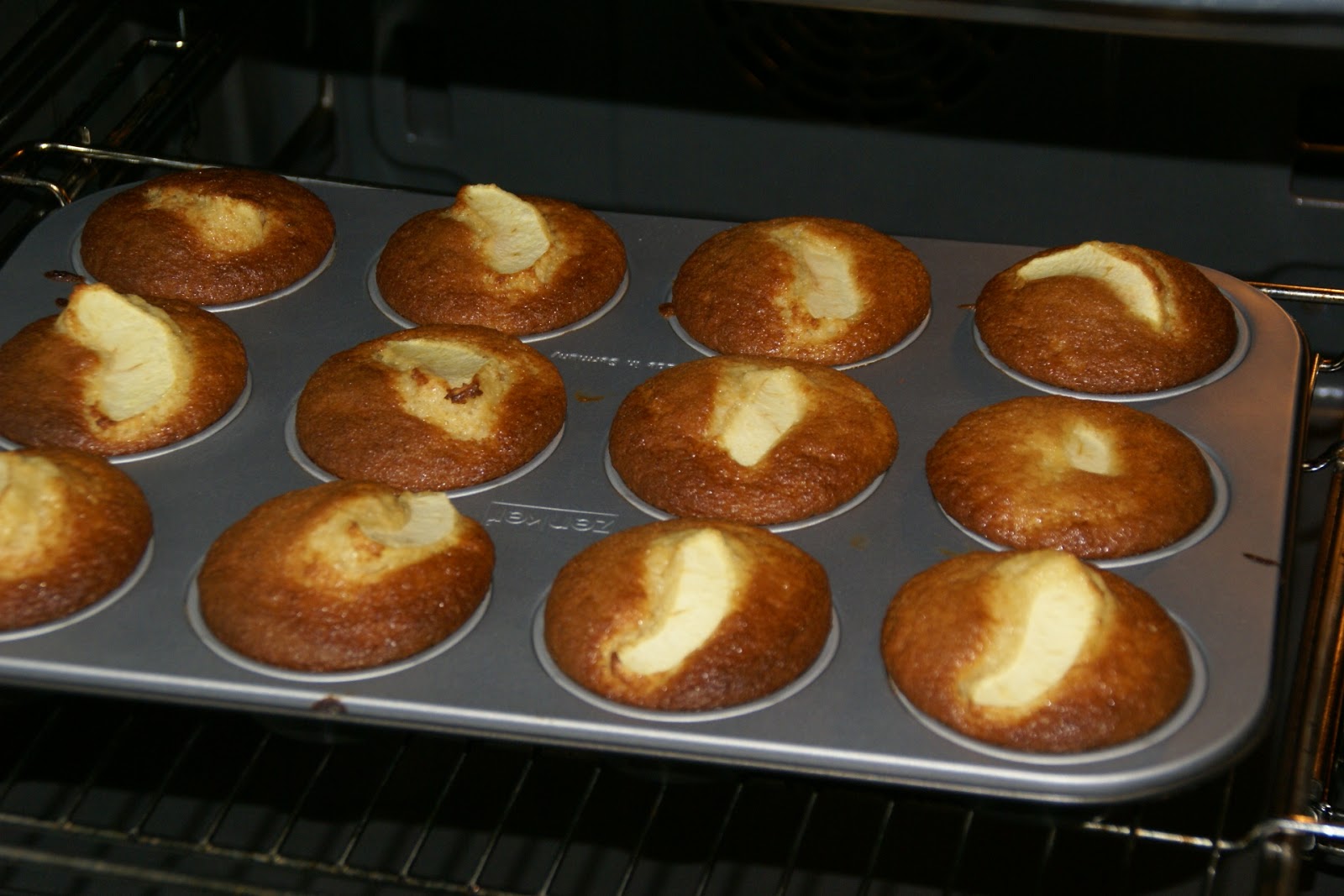 Prepare as formas de queques. Distribua um pouco de massa por forminhas (eu usei de papel, mas pode utilizar formas de queques untadas e polvilhadas de farinha). Coloque uma camada de maçã cortada em gomos ou em cubos e, cubra novamente com massa.