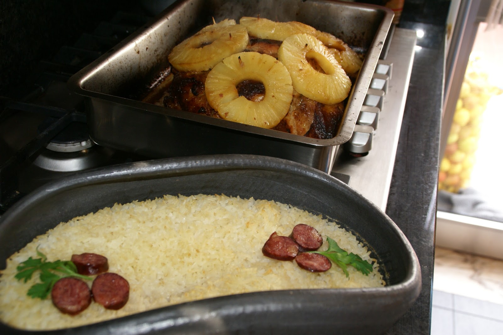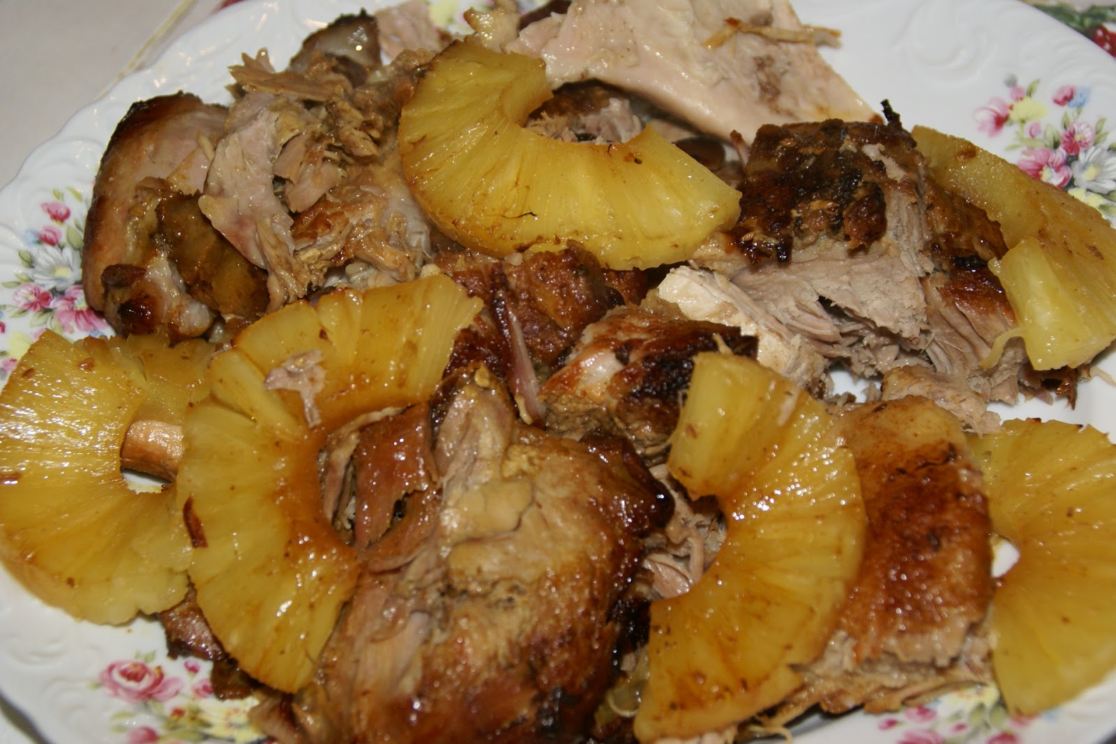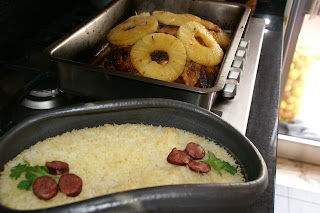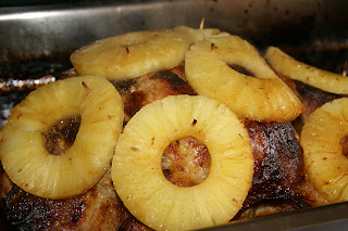 Quando a carne estiver tostada e assada, coloque o ananás (usando palitos para o segurar). E, leve mais 30 minutos ao forno.