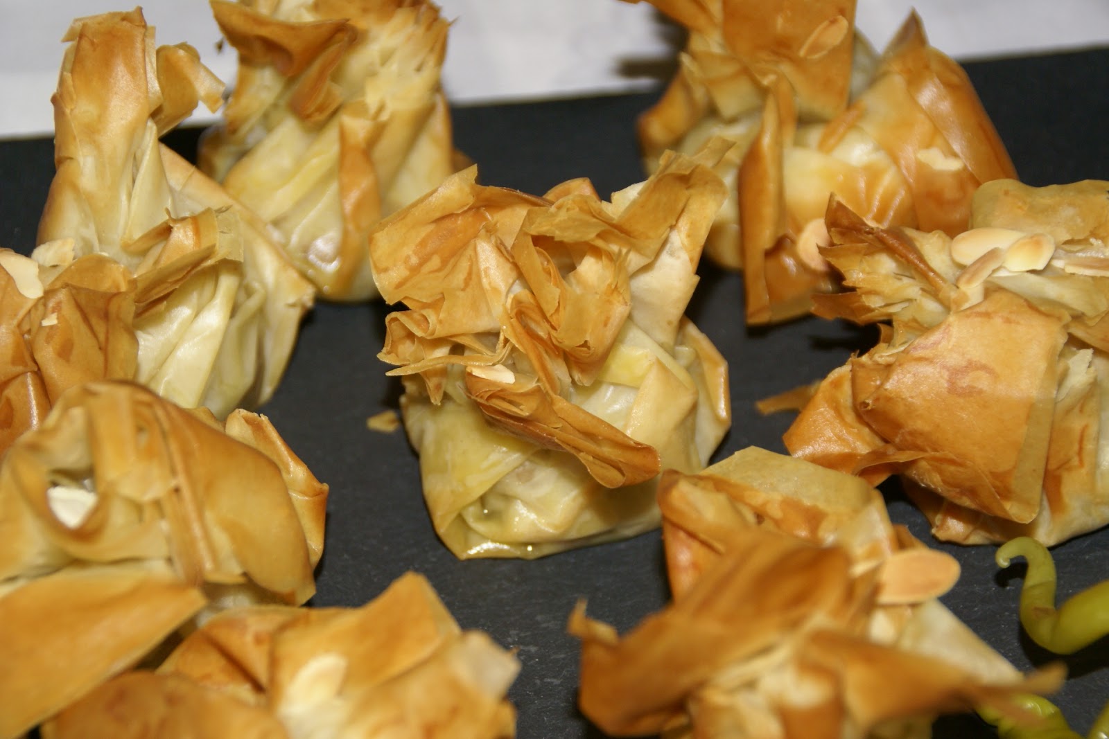 Corte quadrados de massa filo com cerca de 20 cm.Sobreponha 3 quadrados e pincele-os com manteiga derretida ou azeite. No meio coloque um pedaço de alheira, um pouco de maçã picadinha (cerca de uma colher de chá) e polvilhe com um pouco de amêndoa.