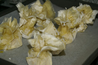 Leve o tabuleiro ao forno com os embrulhos por cerca de 12 minutos. Convém que os embrulhos fiquem dourados e estaladiços.