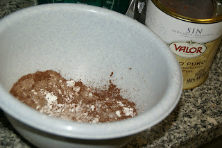 Numa tigela misture o açúcar, o cacau, o amido de milho e o sal. Com uma colher, misture tudo.