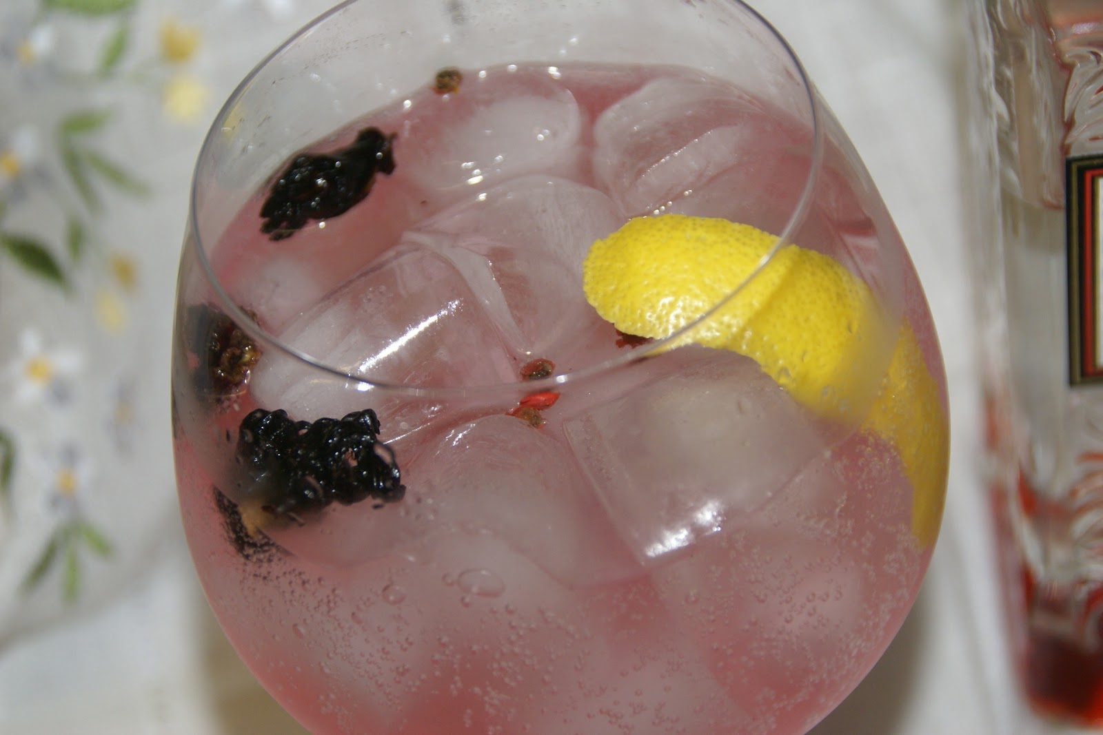 De seguida, coloque as flores de Hibisco e, acrescente o gin. Adicione as bagas de pimenta rosa e o zest de limão. Cuidadosamente acrescente a água tónica. Utilize uma colher e cabo em espiral, para que a água tónica escorra sem perder a bolha.