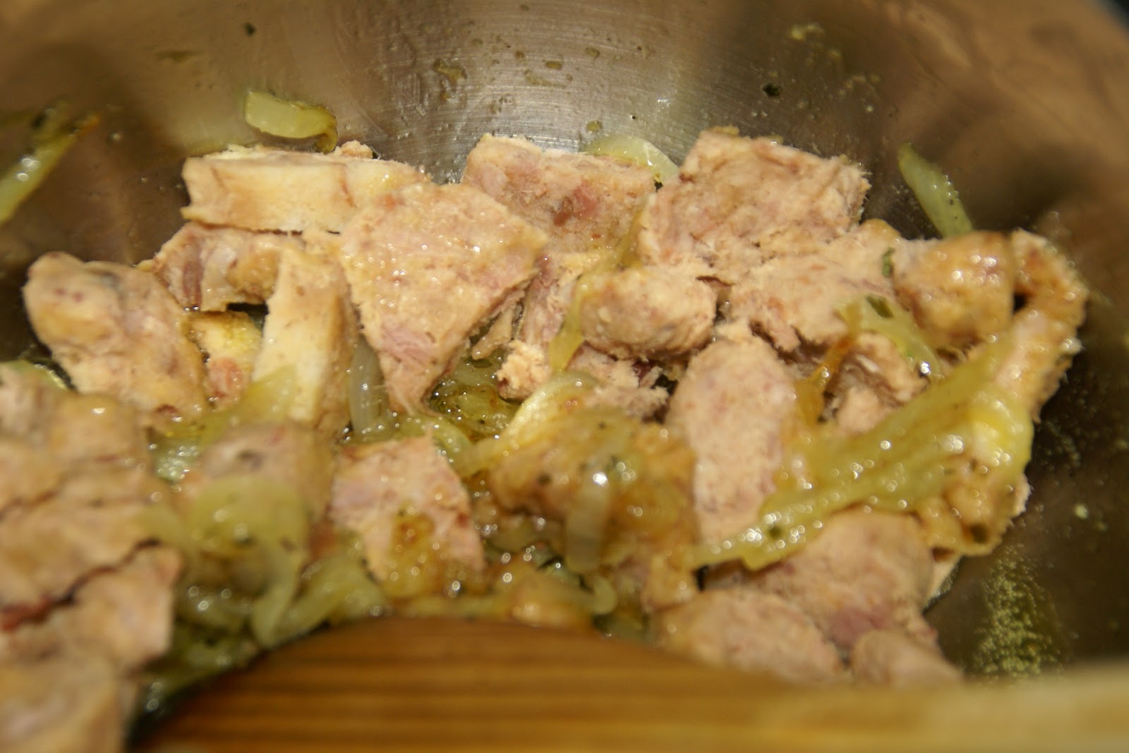 De seguida, tire a pele à alheira e corte em pedaços pequenos. Junte os pedaços de alheira à cebola e misture bem.