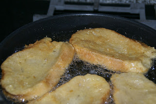 Escorra o excesso de líquido das fatias de pão; passe-as pelo ovo.