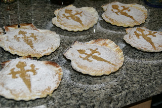 De imediato, coloque o molde da cruz de Santiago e polvilhe abundantemente com açúcar em pó. Retire, com cuidado, o molde da cruz e deixe arrefecer.