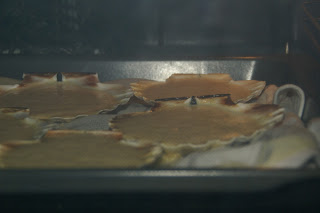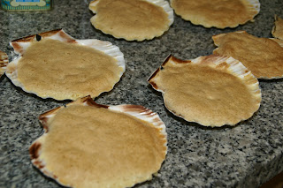 Unte muito bem nove conchas de vieiras e disponha-as num tabuleiro (tem de ficar direitinhas - use um pano de cozinha ou sal para as equilibrar). Usei um pano molhado. Verta o preparado dentro e leve ao forno, pré-aquecido a 180º durante 25 minutos.