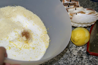 Numa tigela coloque o açúcar e a amêndoa moída e misture muito bem. De seguida junte a canela e a raspa do limão. Volte a misturar.