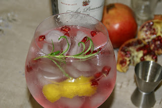 De seguida, verta o sumo de romã, o gin e o ramo de rosmaninho. Passe a casca de limão pelo interior e pelo bordo do copo. Usando uma colher de cabo em espiral, verta cuidadosamente a água tónica. Deixe escorrer lentamente para não perder a bolha.