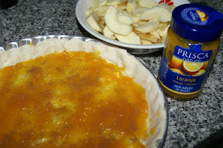 Espalhe no fundo da tarte a compota. Pode ser qualquer uma do seu agrado.